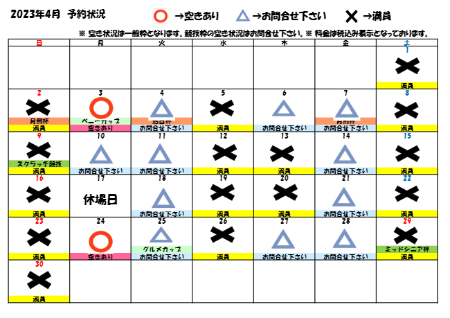 ※空き状況は一般枠となります。競技枠の空き状況はお問い合わせください。